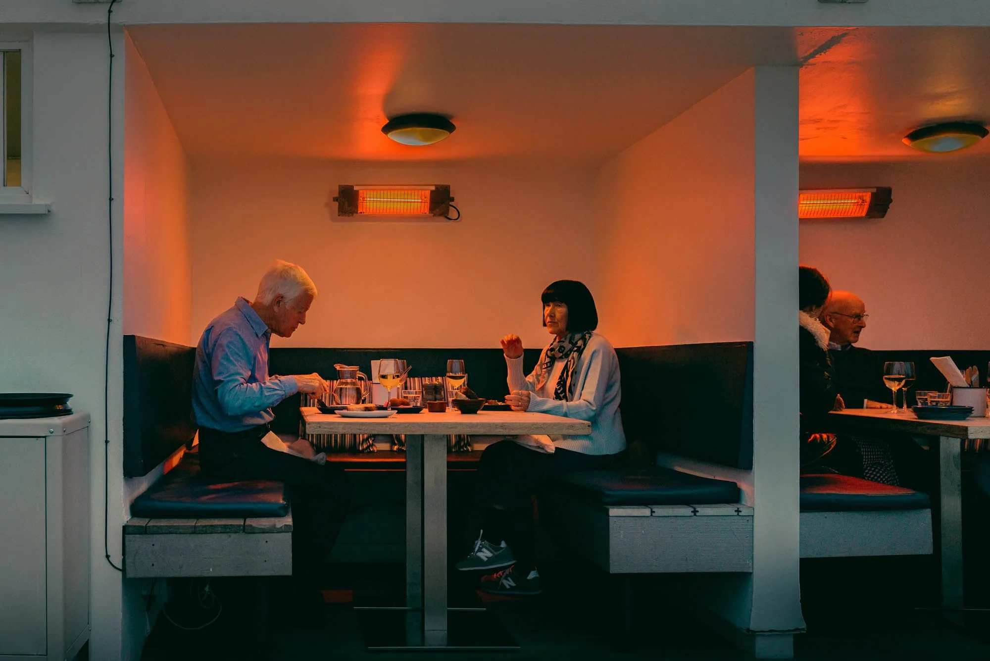 Pods- individual heated pods. Seating 2 to 6 people. Open to the elements with sea views