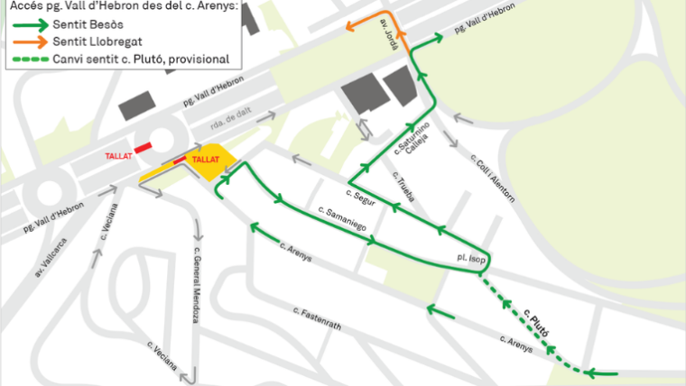 L’afectació principal és el tall de la rotonda a la confluència del carrer d’Arenys amb el passeig de la Vall d’Hebron. El canvi de sentit del passeig de la Vall d’Hebron en aquest punt s’haurà de fer per la rotonda al carrer de Jericó o bé per l’avinguda de Jordà.