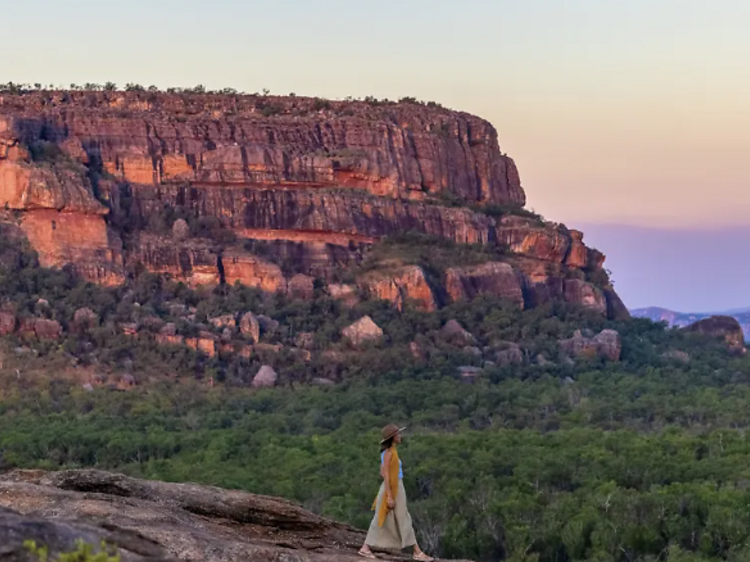 If you want another good sunrise (or sunset) spot, look no further. The lookout is a 30-minute drive from Jabiru, so you don’t need to get going too early to catch an epic look at first light. Get on the one-way walking track and clamber up a slight rocky incline (it is a little steep in parts; you’ll need to be of moderate fitness) and head up to the rock platform that overlooks an impossibly wide stretching view across a bright green savannah, the Anbangbang Billabong and the ochre cliffs of the Arnhem Land escarpment. Keep your eyes peeled for rock wallabies and let yourself dissolve into the soft pastel silence.