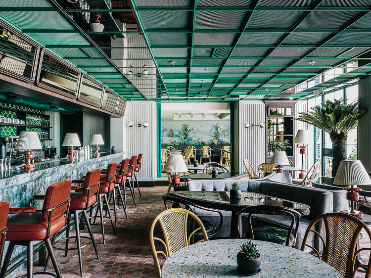 Fu turned the Grade II historic building at PMQ previously occupied by Aberdeen Street Social into a fictional private home. The ground-floor bar and casual dining space, which serves drinks and light bites all day and night, is awash in jungle green, false bird-of-paradise carpet and paintings that depict vaguely familiar island scenery. The second-floor dining room, where you’ll sit down to lunch or dinner, features a warm colour scheme infused with splashes of goldenrod and bone white. Rattan plays a big role, too – in the seating, in the geometric patterns adorning the ceiling, in the wicker-like weave of the carpet.