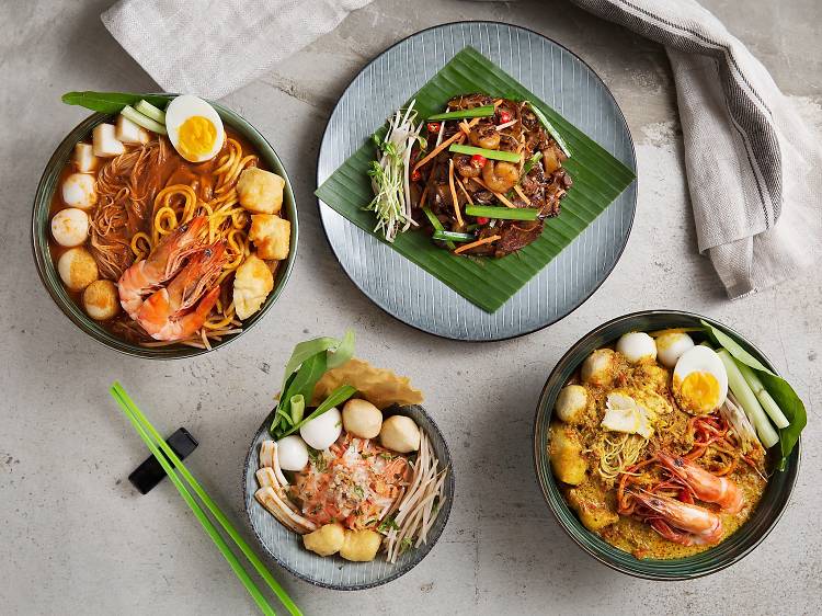 Decked out in differing shades of green, from mint to teal, the decor is patterned after Malaysian batik cloth. Marquee lights above the open kitchen spell out ‘mean’, presumably a pun on ‘meen’, the Cantonese for noodles, and, we hope, an indicator of the kickass nature of their fare.