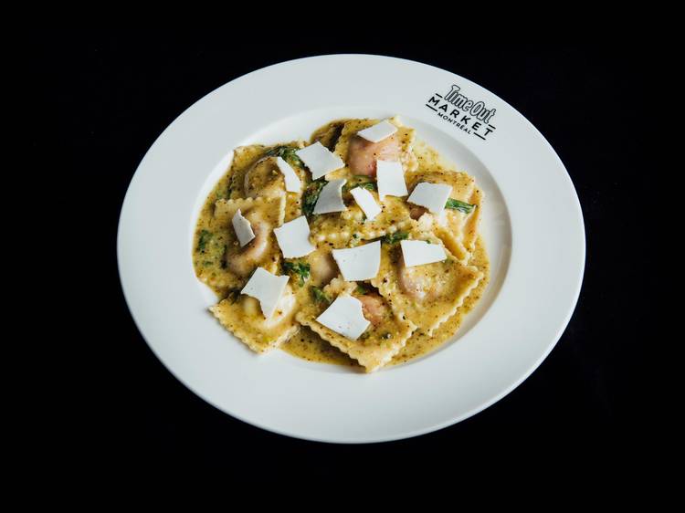 Ravioli, mushrooms and ricotta filling, Alfredo sauce (cream, parmesan and porcini purée), hazelnuts