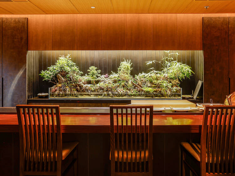 香港四季酒店45樓全新日本高級天婦羅鐵板燒料理鉄板焼.天ぷら旬,融合日本江戶前天婦羅與精緻鐵板燒料理的概念,堅持採用新鮮的時令食材,講究細緻擺盤,提供高級精緻的廚師發辦菜單。餐廳由兩位日籍主廚坐鎮:鐵板燒主廚神子仲康(Nobuyasu Kamiko)及天婦羅匠人本鄉雅志(Masashi Hongo)。鉄板焼.天ぷら旬分別提供天婦羅及鐵板燒料理的午市菜單($1380/位),晚市則二合為一,提供鐵板燒天婦羅廚師發辦($2680/位),由前菜、湯品、天婦羅、刺身、肉料理、 海鮮、蔬菜和甜品,菜單豐盛。招牌菜有鐵板燒和牛,用上日本宮崎和牛牛柳芯,煎香兩面至五成熟,簡單加鹽調味,和牛入口帶有細膩的油花,肉質柔軟無比,再佐以鐵板炒過的脆蒜片更為惹味;另一道原隻日本活伊勢龍蝦,鮮嫩多汁,肉質爽彈,配搭鐵板燒舞茸及日式酸瓜粒,層次豐富。