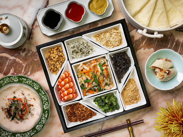 茗悅的室內設計靈感來自香港的自然環境,融合中式元素及西方風格,營造溫馨而輕鬆的氛圍。餐廳採用了綠色為主色調,與赤陶色巧妙地形成對比,營造出迷人的視覺享受。大理石和精緻的木雕細節增添了一絲歷史感和魅力,特別定製的壁紙則捕捉了香港植物的精髓,而家具和陶瓷裝飾為空間營造出戶外自然感。