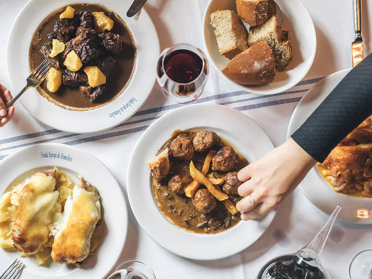 La carta son unos grandes éxitos de la tradición catalana, con un enfoque contemporáneo y con un punto muy importante: comerás estos platos en uno de los lugares que los fijaron en la conciencia colectiva. Ejemplos, a puñados: su fastuoso capipota -que puedes solicitar en media ración-, los canónicos macarrones con sofrito de cerdo y ternera y gratinados, o la señal de identidad de la casa: los platillos catalanes -guisado con picada hecho a fuego lento- con imperdibles como la sepia y albóndigas y pie de cerdo o el meloso de ternera a la ratafía. No puedes olvidar los arroces, claro: recuerda que aquí el apellido es Parellada. ¡Y bien vale una escapada de fin de semana para ponerse fino!