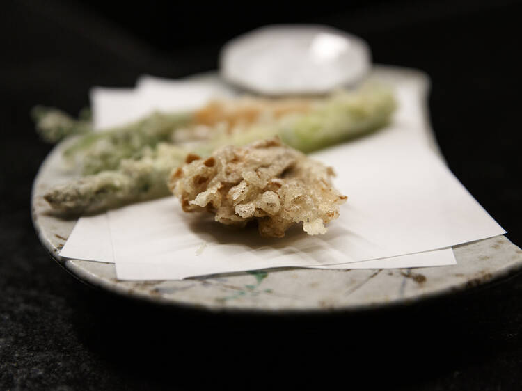 Aunque es común encontrar restaurantes dedicados a esta especialidad en Japón o Estados Unidos, como los míticos Tempura Yaguchi y Tempura Matsui, todavía no habíamos visto nunca en Barcelona. El origen de la propuesta, como no podría ser de otra forma, se remonta a un recuerdo culinario. "Queríamos recrear una barra que visitamos en un Hilton de Tokio hace 20 años, que ya no existe", explica Busquets. "Era como entrar en una joyería: el propietario abría cajones y nos mostraba el stock de verduras, pescado y marisco para que eligiéramos".