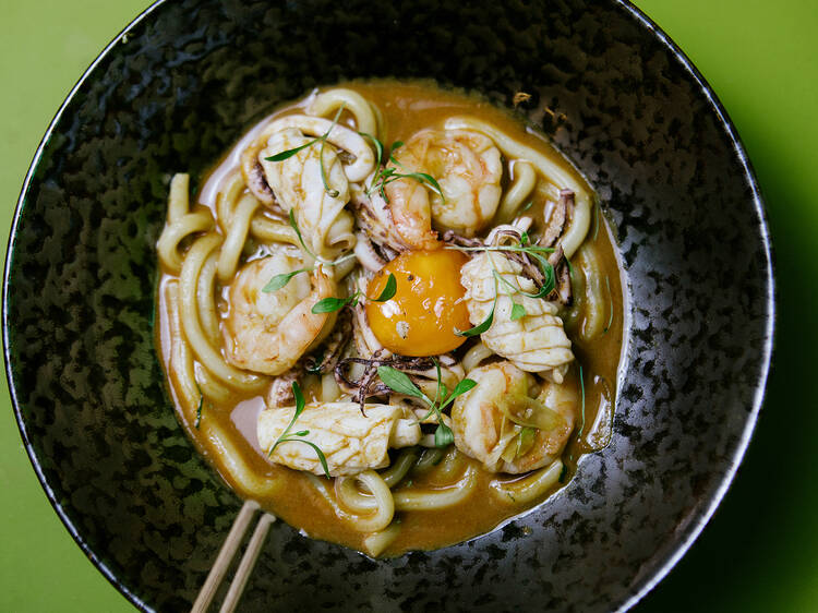 Y nos rendimos al estilo y creatividad de la chef Alejandra Ormeño, que ha logrado un equilibrio fenomenal entre la voluptuosidad de Perú y la precisión de la cocina japonesa. Si el 'nikkei' en sí mismo ya es un estilo de fusión, ella innova dentro de ese marco con una cocina de autor que pone el pie en dos o más gastronomías por plato con naturalidad y acierto. Un ejemplo magnífico son unos fideos udon donde el caldo es un chupe de camarones que remite al 'suquet', y de picante medido aligerado por brotes de cilantro. O un 'hako sushi' –'ngiri' cuadrado hecho en caja– de innovadora receta: tartar de ternera con salsa de 'lomo saltado', el salteado de ternera peruano. El menú de mediodía posibilita disfrutar de esta cocina por 22 euros.
