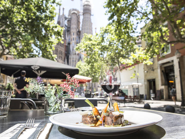 Además, tiene una terraza difícil de creer –desde la avenida Gaudí, que baja, se domina todo el panorama– donde te llevan tapas y platos clásicos con un toque creativo: albóndigas, calamares a la romana, suquet de rape, y también arroces de lo más recomendable (del señorito, de presa ibérica, o el de butifarra negra con setas).