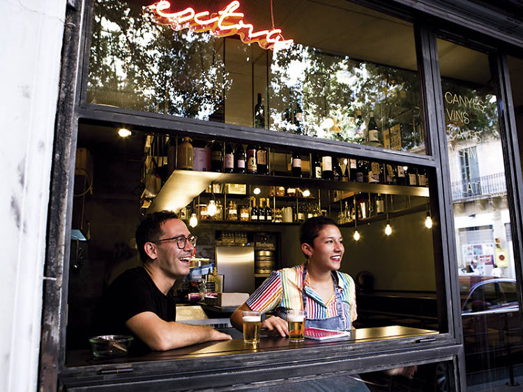 En Barcelona se puede comer fatal por 20 euros por cabeza, pero también, aunque a veces parece imposible, se puede comer muy bien. Es el caso de este restaurante mini, con sólo una mesa alta para compartir con taburetes, una pequeña barra y un espacio para seis personas que sale a la calle. El Extra Bar ha sido una de las sorpresas más agradables que nos ha dado últimamente Gracia, un lugar siempre lleno, incluso con colas por parte de una clientela enamorada de su cocina catalana y asiática, y del aire informal que se respira.