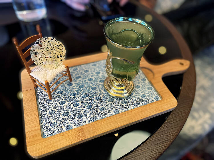 Su obsesión por crear le lleva a dividir la carta en Repertorio, con las 15 obras de arte que transforma en cócteles de autor, y en clásicos con el twist de Harrison. 'Como el agua' -se bebe como ídem- pertenece a la primera parte, un gimlet largo, fresco y aromático. Moruno, además. Con base de ginebra, vermut infusionado con aceitunas malagueñas y eucalipto, un cordial de rebujito (manzanilla, solución cítrica y limones encurtidos al estilo marroquí) y un bitter a la andaluza. 'Guernica' habla de la resiliencia del ser humano. Cuando se va el humo (del bombardeo y del palo santo) queda cierto recuerdo agridulce de algo mejor (los pimientos de Gernika) y aparece un daiquiri complejo. 'Forrest Gump', en su caso, se acompaña de un pan de gambas y parte de un Mint Julep con bourbon picoso, bombón de chocolate, hierbabuena y ginger ale. Así 'My Way', 'El viejo y el mar', 'Cadena Perpetua'…