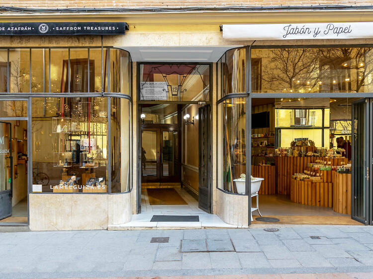 Jabón y Papel es hermana de su vecina La Melguiza, la única tienda especializada en azafrán de España, con la que comparte escaparte (solo separadas por el portal), identidad y filosofía. Porque de ella ha heredado ese espíritu por el "producto artesano, de origen natural y bien hecho", como señala su propietaria Marta Huerva. Los jabones proceden de un taller artesano de Zaragoza, de donde se los traen en barra para después cortarlos uno a uno aquí en la tienda de Madrid. Cuentan con más de 30 variedades: desde el jabón de Alepo, el más antiguo del mundo (se dice que nació en Siria hace más de 3.500 años), al de leche de burra, uno de los más solicitados, todos elaborados con aceite de oliva e ingredientes naturales (papaya, raíz de regaliz, té matcha... Y chocolate, naranja y canela, caléndula, aceite de jojoba, karité, argán o el de violetas, todo un homenaje a la ciudad de Madrid.