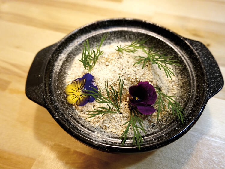 "Dejamos la carta. Era una sangría económica. Nos quedamos con el menú degustación. Pero, salvo dos o tres platos fijos (nuestro huevo con setas es intocable), no nos cerramos a nada. Probamos ideas constantemente, si vemos algo que nos gusta o nos resulta interesante, cambiamos porque si no lo hacemos, nos aburriríamos", apunta Daniel, responsable y chef de esta fabulosa fusión asiático-mediterránea que, a cada plato, estéticamente notables todos, busca evidenciar su carácter. Pronto cambiarán de ubicación, se han mudado fuera del mercado, a Chamberí. Están a vueltas con los renders y, en breve, con un kamado a la vista y una vitrina con producto del día (menos el pescado, el marisco y los helados, todo sale del mercado), que dibujarán un espacio aún más entretenido para el comensal. "Un día me cansé de trabajar para otros y ahora estoy orgulloso de poder hacer lo que me apetece. Pero nada de esto hubiera sido posible sin la ayuda de mi hermano, que gestiona la sala".
