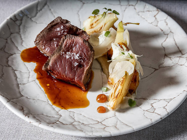 Tras una reconfortante crema de galeras, y una vez empapados en aceite extra Picual temprano Elizondo nº3, las pinceladas de mercado pasan por el aperitivo de foie mi-cuit con codorniz de Las Landas en vinagreta o por la tortilla con lardo ibérico adobado. En cuanto a los autodenominados clásicos de Don Dimas, imperdibles las croquetas de chocos en su tinta (guiso típico de El Rompido), diferentes y celebradas. El steak tartar de vaca madurada sobre tuétano y coronado con anguila ahumada es un mar y montaña ganador. O el también fundamental canelón trufado de faisán salvaje y cordero con un gratinado delicado de payoyo. Sin mencionar, las guarniciones y, por supuesto, todo el marisco fresco que llega a diario por mensajería urgente.